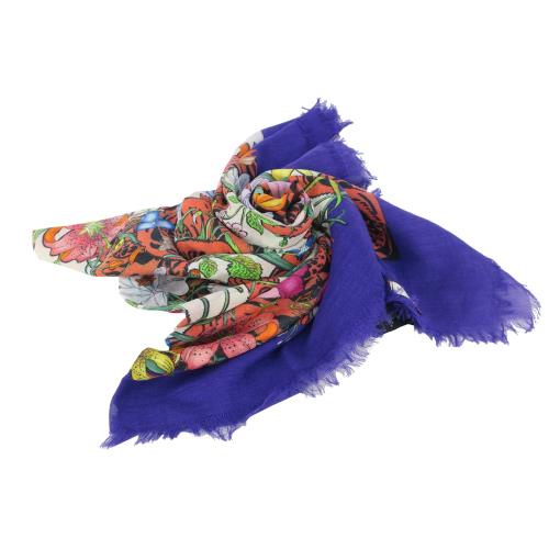 GUCCI 羊毛混絲植物老虎圖案流蘇披巾/方巾(紫)
