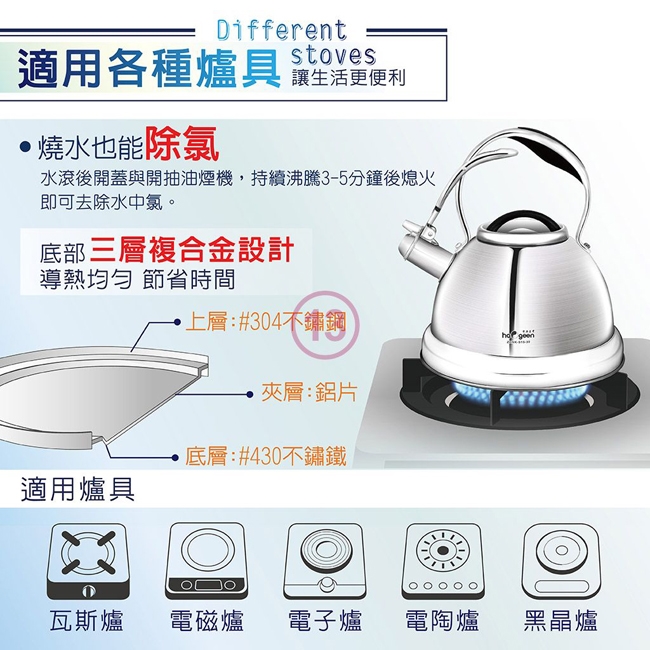 (4) 底部三層複合金設計,加厚壺底均勻導熱,節省時間