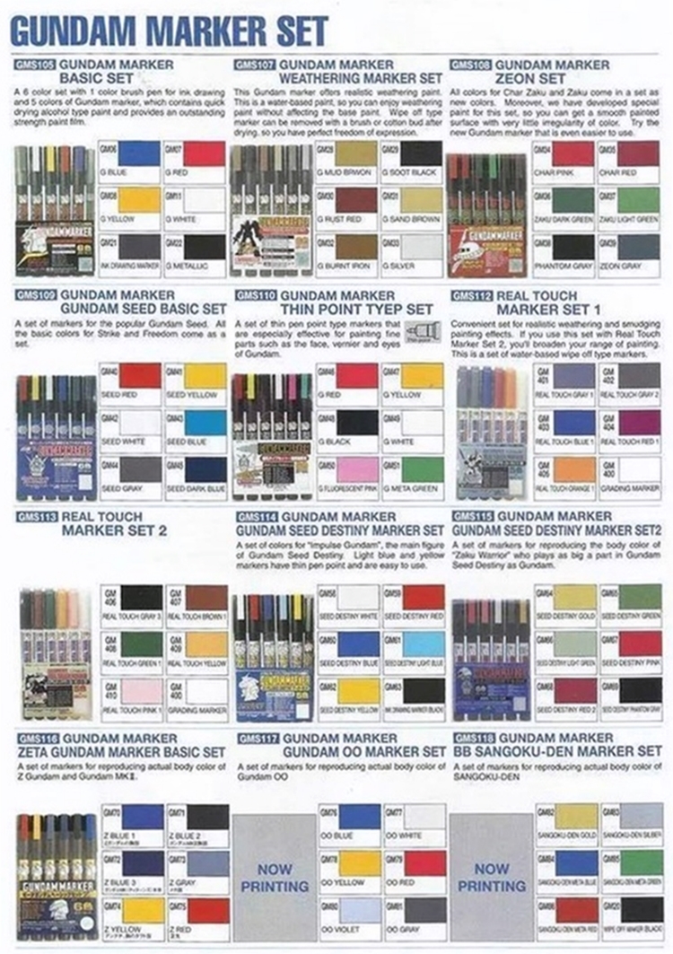 鋼彈專用的麥克筆套組,此組合為6支組,內含-GM34(橘色)、GM35(紅色)、GM36(墨綠)、GM37(綠色)、GM38(黑色)+GM39(深灰),此套組麥克筆適合用來補色及小面積上色。