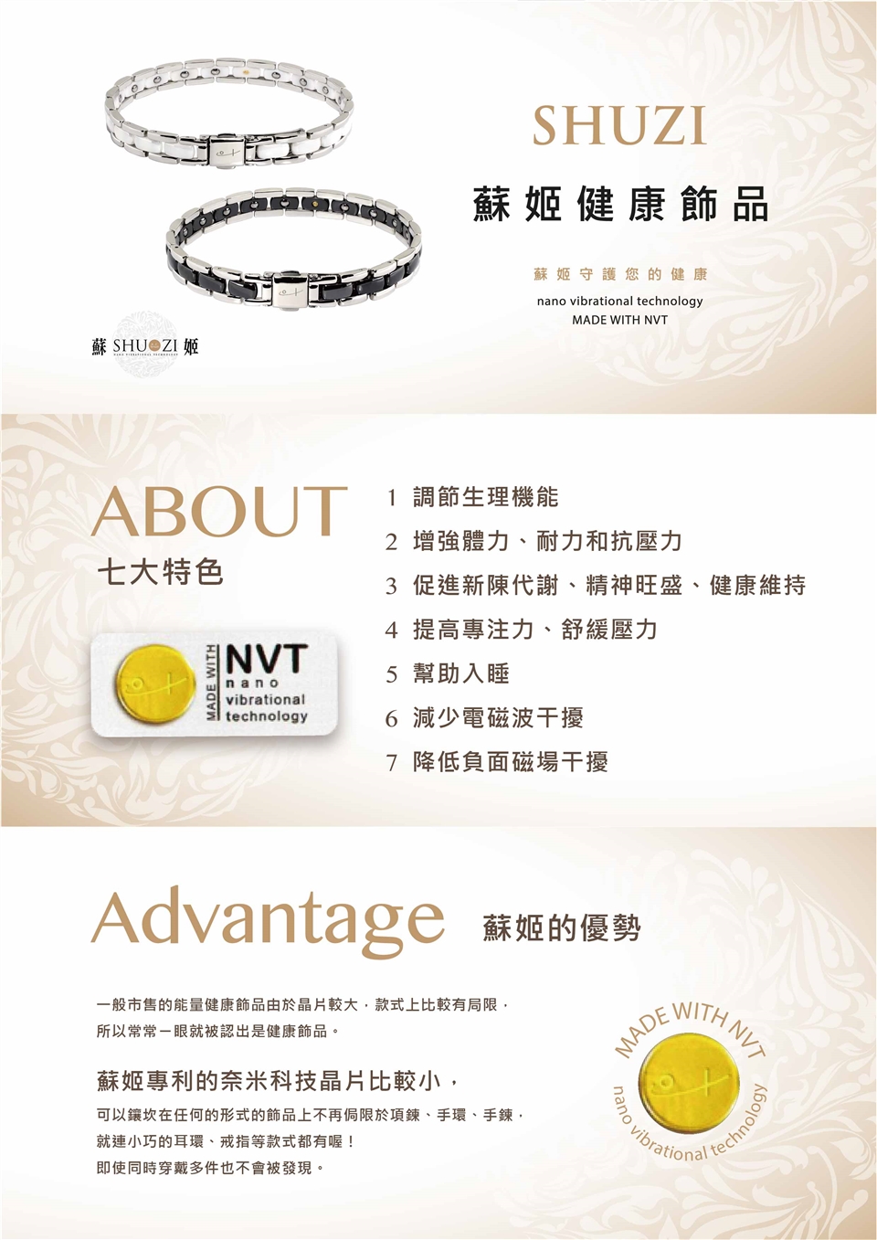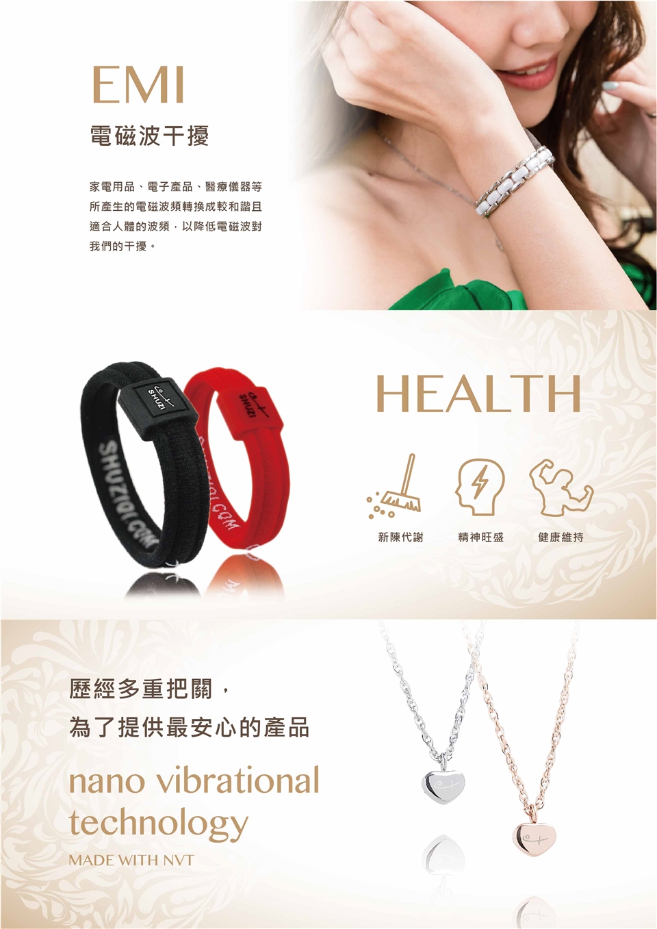 SHUZI產品利用您身體本身的能量系統,最好無時無刻配戴它,即使睡覺也不例外。檢測顯示,shuzi產品只要貼近身體就能產生效果。所以可以選擇您習慣配戴的部位商品配戴即可。基本上只要貼近您的身體NVT奈米振動技術的效果都是相同的!