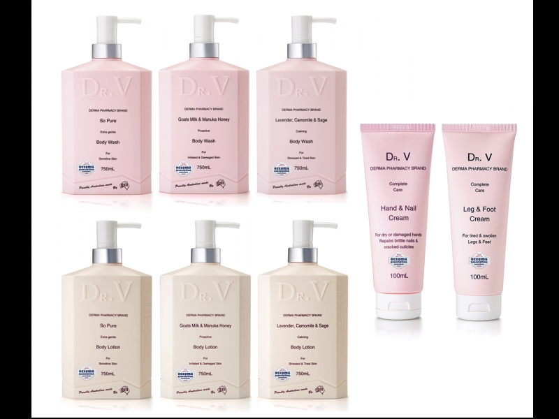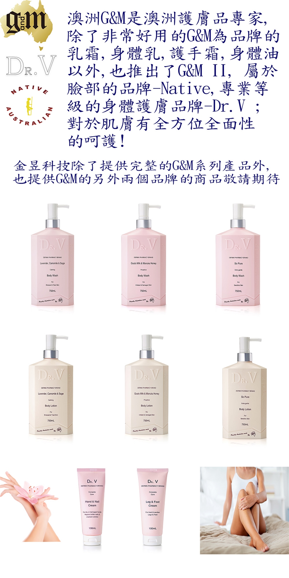 這是澳洲護膚品大廠 G&M 因為熟悉專業 深感許多肌膚問題,特別延請專業研發的Dr. V 系列 身體護膚商品, 從沐浴乳,身體乳霜, 護手、指乳霜、護腿、腳乳霜等;是非常溫和的配方,從嬰兒到老年人都可以使用。