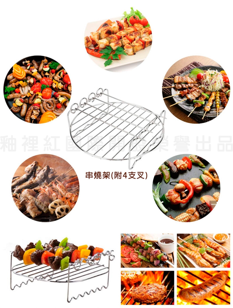 內容物: 蛋糕籃、披薩盤、隔熱墊、串燒架(附4支叉)、金屬蒸架、麵包吐司架
