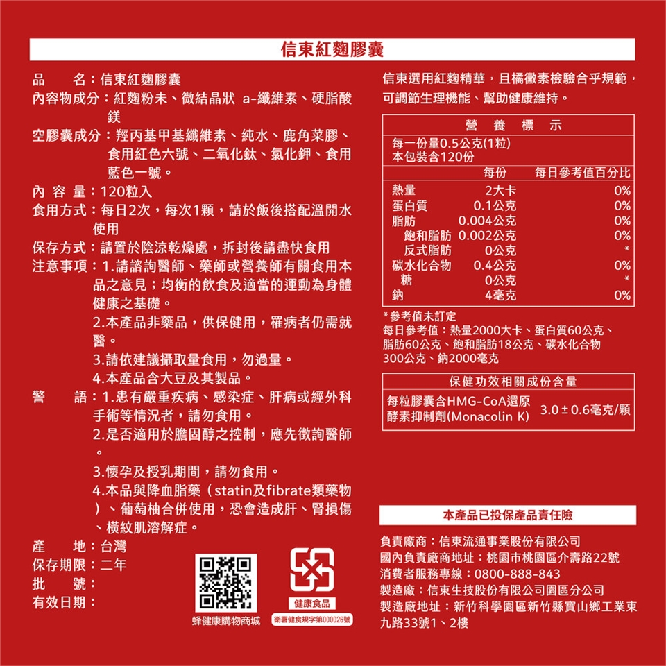 警 語:本產品不應替代藥品使用 ; 孕婦、哺乳婦、服用司他汀(statins)類藥物者避免食用。