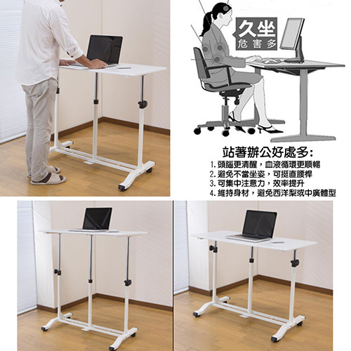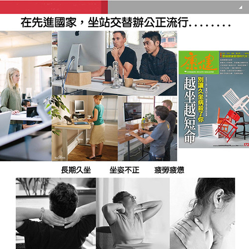 坐久了,腰酸背痛、頭昏腦脹、新陳代謝減慢、腸胃蠕動減緩、肚子與屁股日漸變大….桌面太高,雙手攀在桌上造成聳肩的肩膀痠痛;桌面太低,頭頸低垂造成彎腰駝背姿勢不正。既然維持固定的姿勢工作或讀書有那麼多後遺症,何不站起來工作或讀書,告別久坐人生的壞處,在站與坐之間取得平衡!