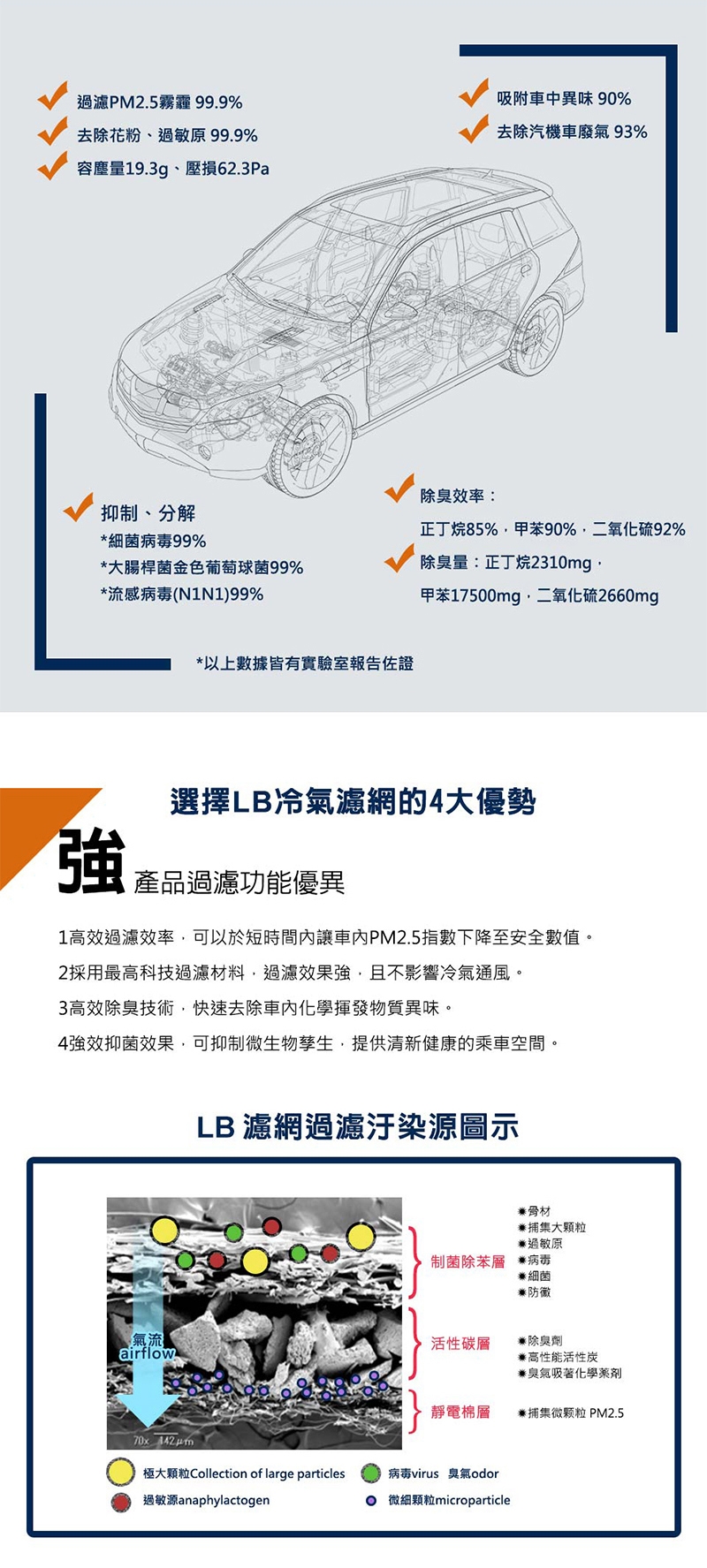 主要成分:抗菌濾網過濾纖維、活性碳濾網過濾纖維、靜電濾網過濾纖維