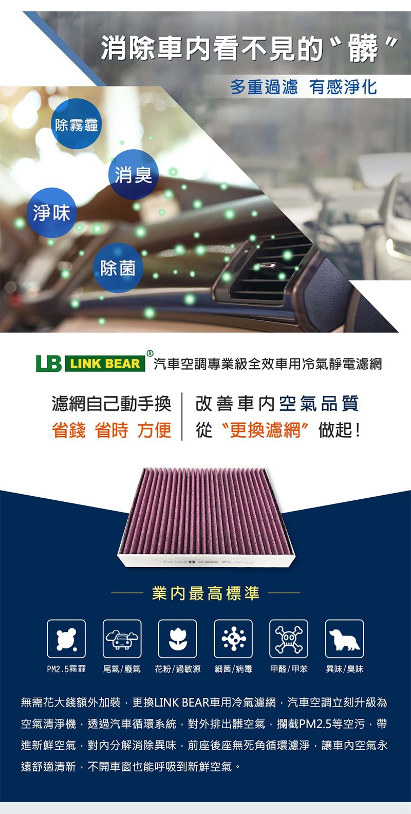 品名:【LINK BEAR】汽車空調 專業級 三層冷氣靜電濾網 (紫款) 適用 TOYOTA 19年前車系