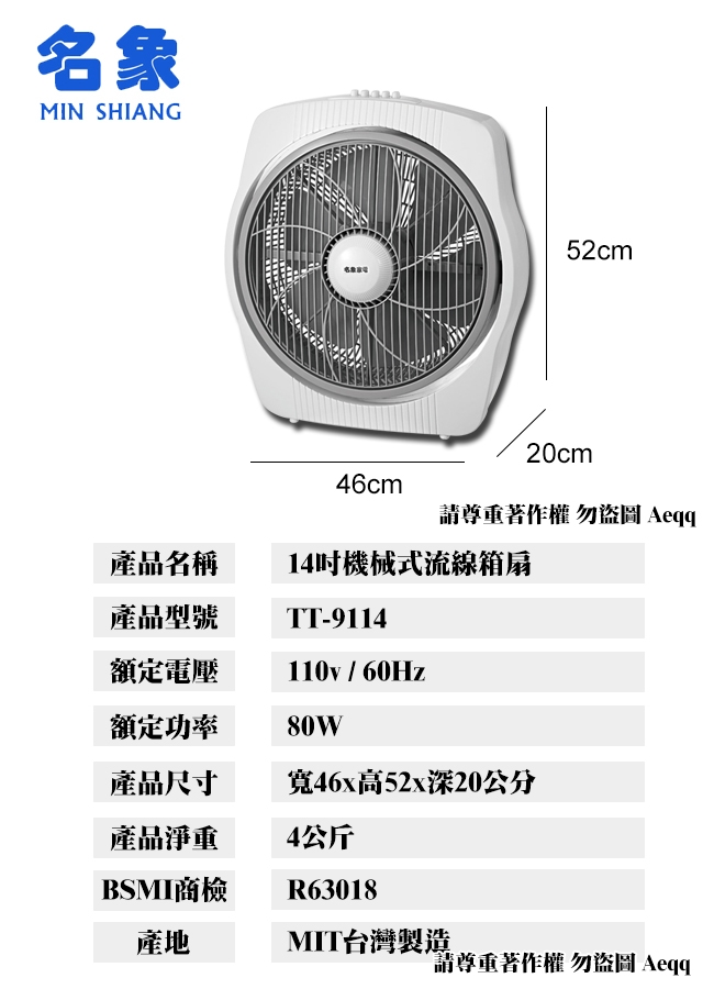 【MIN SHIANG 名象】14吋機械式流線箱扇(TT-9114)