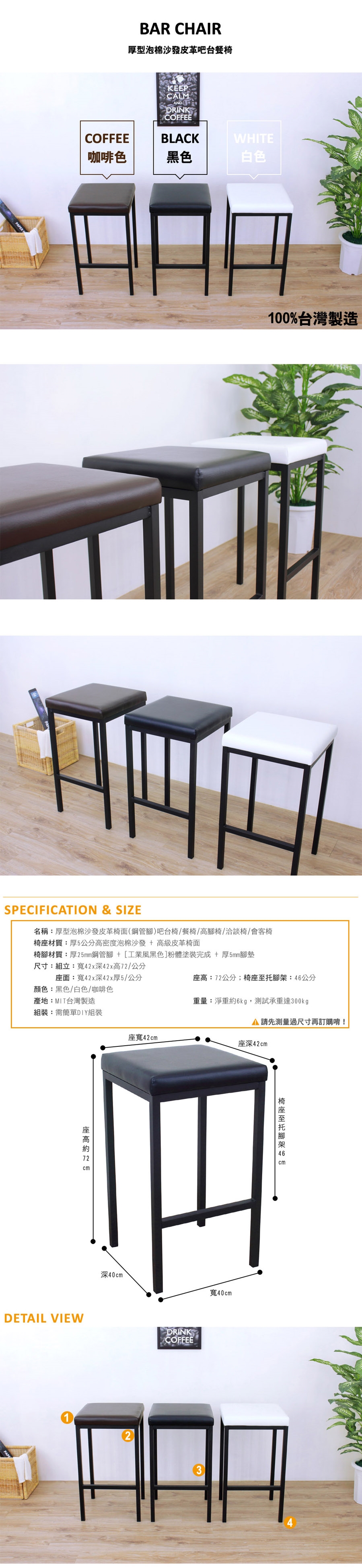 ◆椅座高度:72 公分;椅座至托腳架:46 公分。