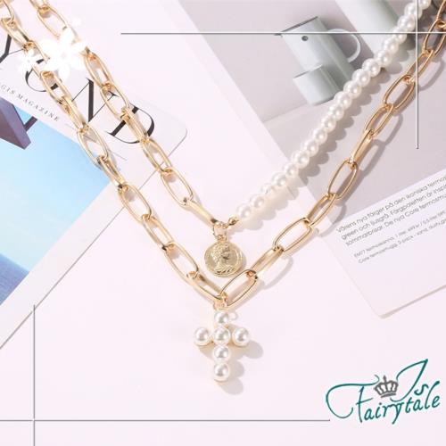 【伊飾童話】珍珠十字架*華麗金繽粗鍊雙層項鍊