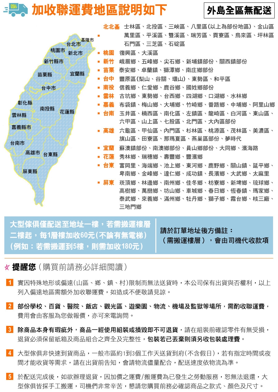 3.如須運送至偏遠山區鄉鎮等地區須酌收運費,運費由本公司貨運部門評估,若有退貨之情形加購運費恕無法退還。