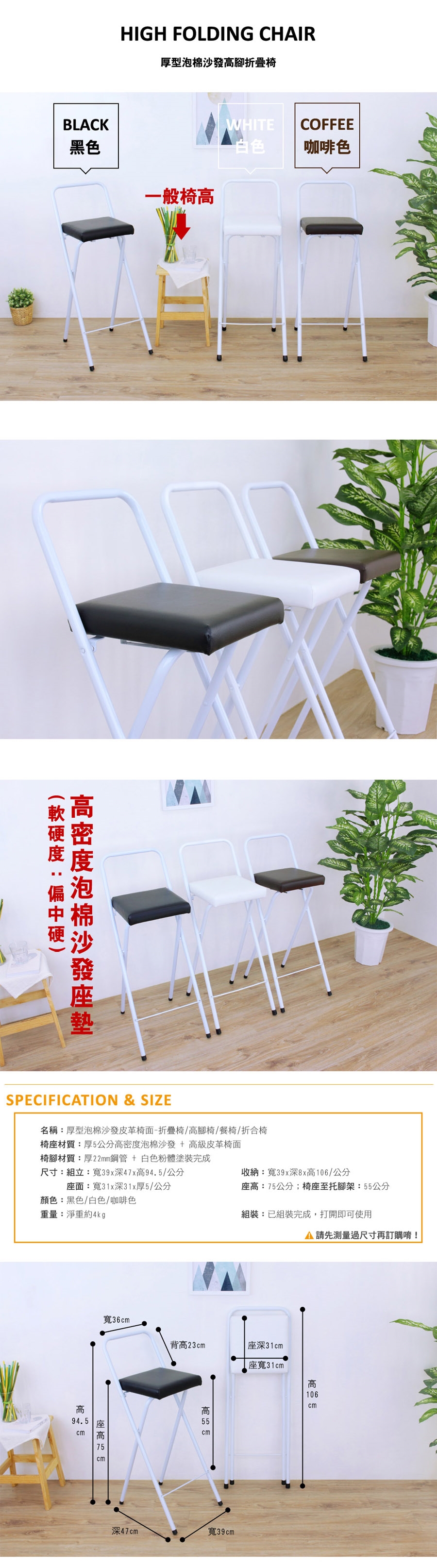 ◆座面尺寸:寬 31 公分 x 深 31 公分 x 厚 5 公分;椅座高度:75 公分;椅座至托腳架:高 55 公分。