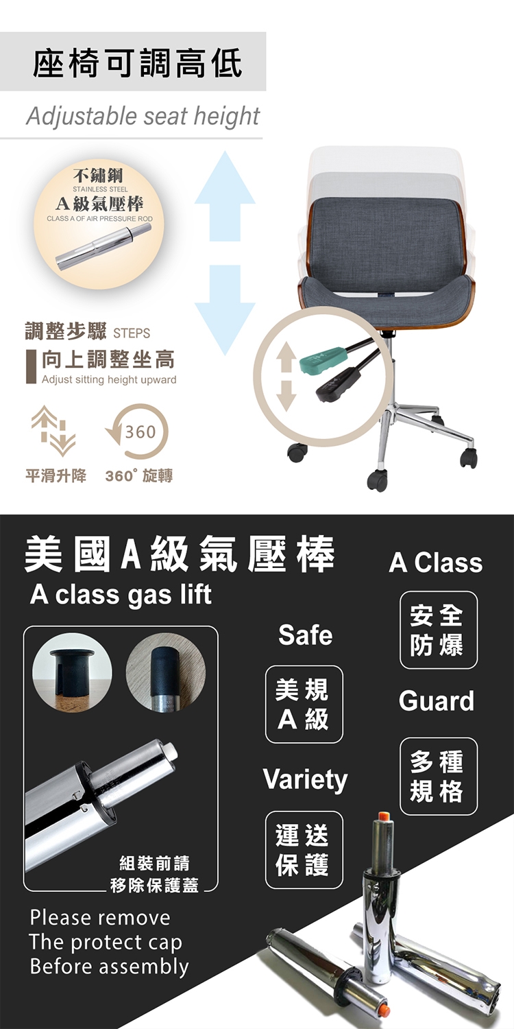 舒適布面座椅、透氣且親膚性佳,椅面寬度升級,魁梧身材也適合,配備美規A級氣壓棒可調高低,調整範圍從44-56 cm