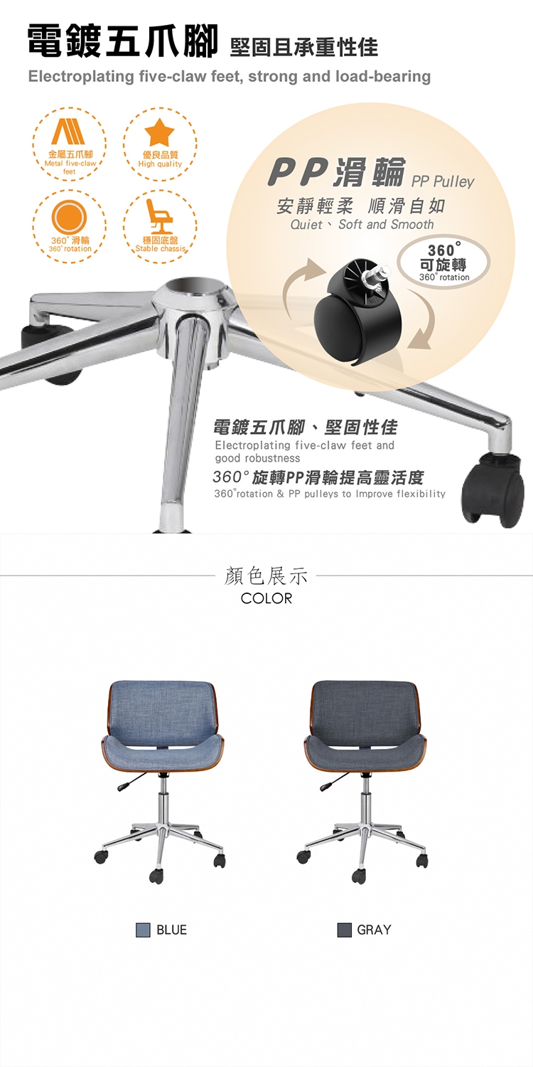 經典電鍍五爪腳搭配尼龍輪穩固耐用,提供出色的支撐,360度旋轉及底部滑輪增強移動性。