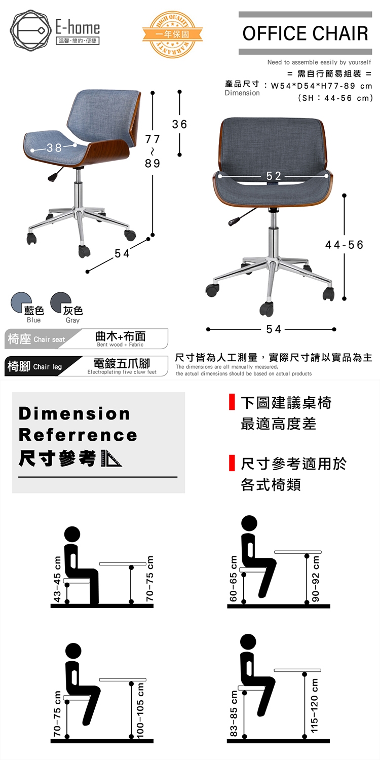 E-home Edric埃德瑞克可調式布面曲木電腦椅 兩色可選