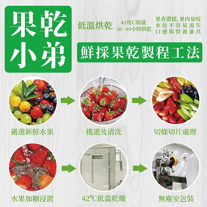 「吃加工的東西久了,味覺鈍了,以天然原味讓大家重拾遺失的味蕾。」無任何化學添加物、防腐劑及任何色素。用42度低溫烘培製成果乾,完美封存果乾的新鮮原味與營養成份。在充斥加工品的現代生活裡,邂逅一場與食物相遇的味覺初戀。