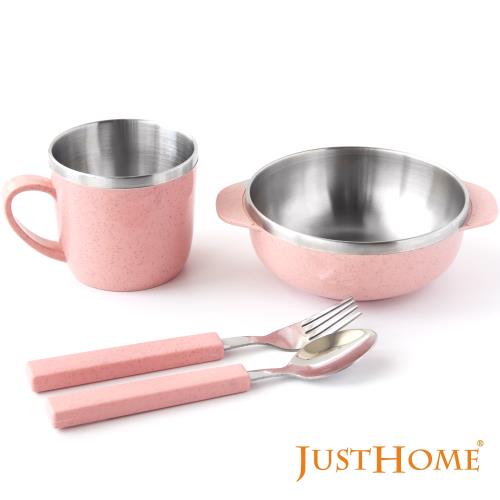 Just Home麥纖維304不鏽鋼兒童餐具4件組(碗+杯+叉+匙)