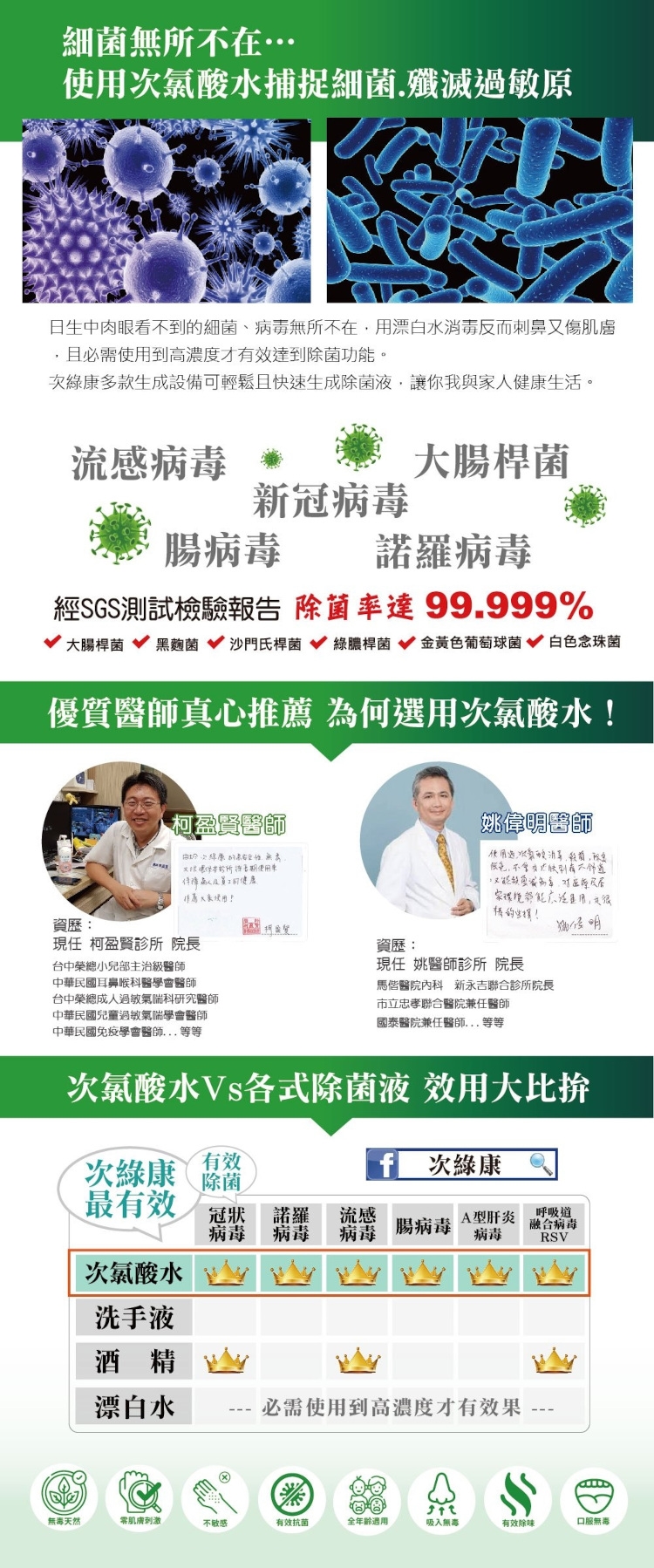 A:次綠康清潔液主成分為食鹽,ph屬就是弱鹼性次氯酸水,其優點就是低殘留,其還原的特性,故無法永久保持清潔效果,需重覆噴灑以形成持續清潔效果,另外也有其效期之限制。