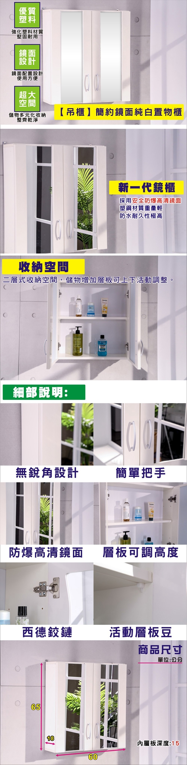外尺寸:寬W60*D18*H65 CM (±2公分為正常值) 內部尺寸: W56*D15*H59 CM (±2公分為正常值)