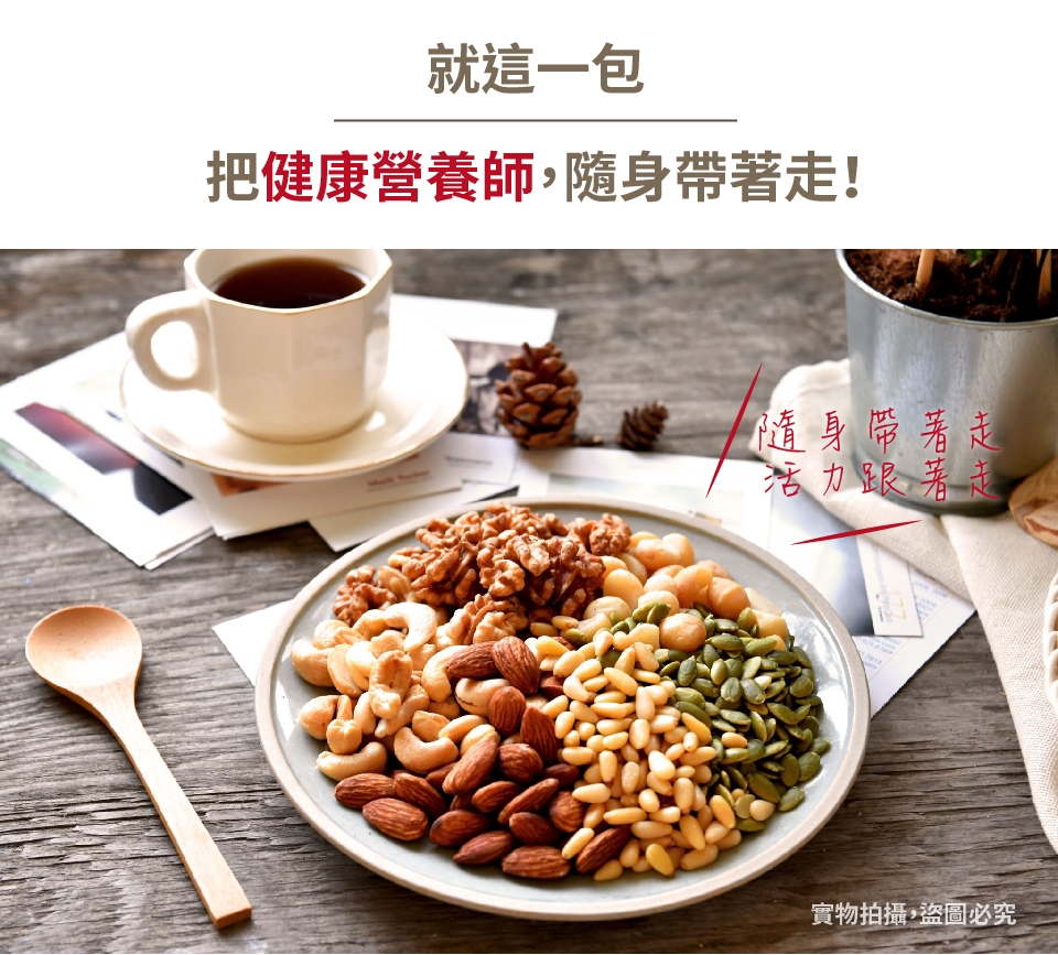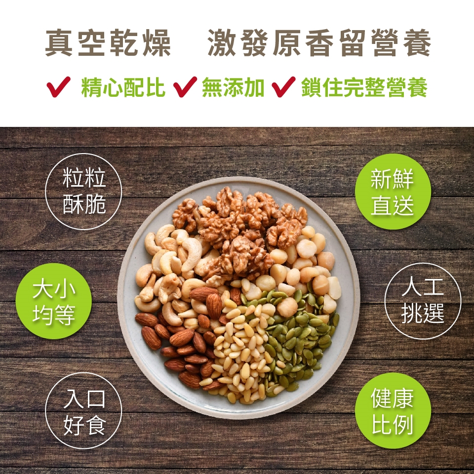 成份:杏仁果、核桃、腰果、夏威夷果、南瓜子、松子、精製棕櫚油、維他命E(抗氧化劑)