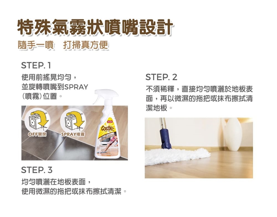 3. 均勻噴灑在地板表面,使用微濕的拖把或抹布擦拭清潔