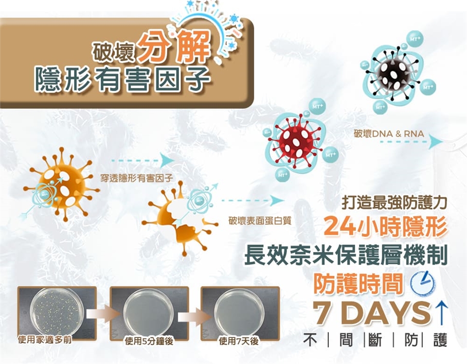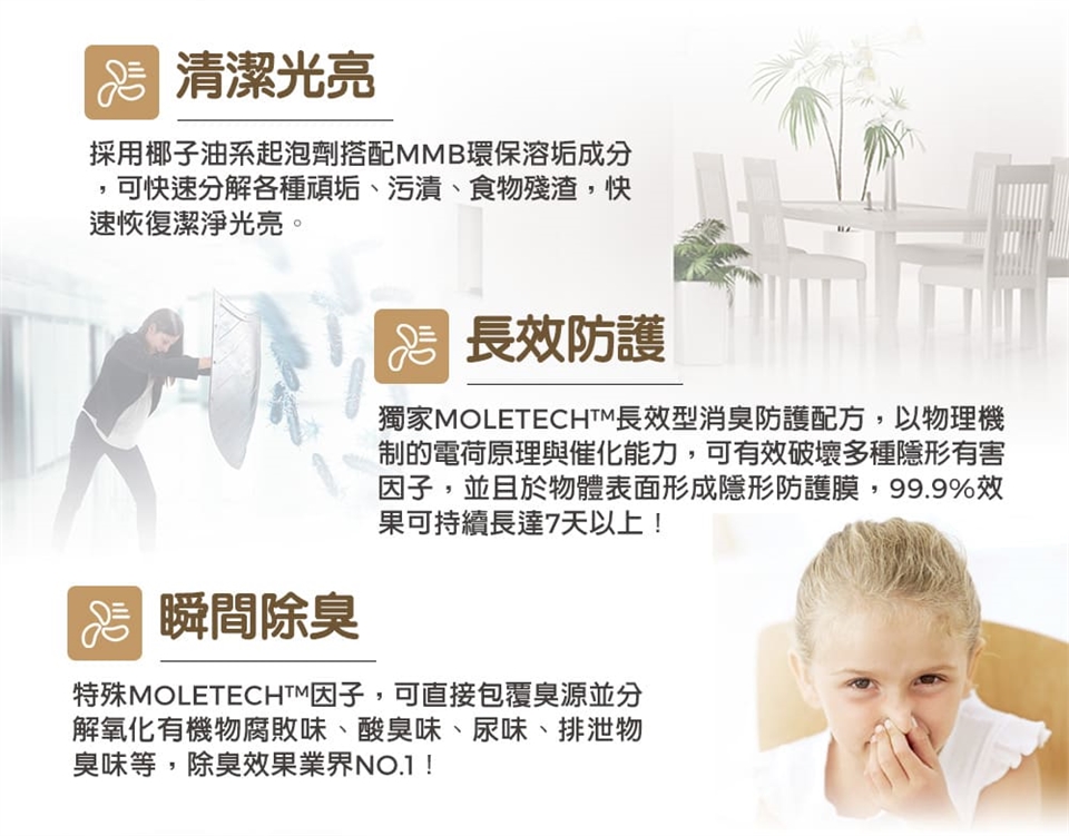 搭載 MOLETECH™ 長效型消臭防護配方,以物理性電荷中和原理穩定防護表層,維持長效清新環境。