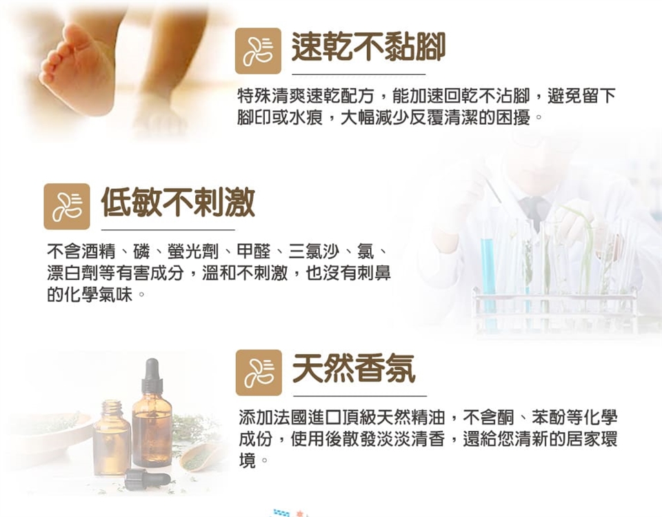 特殊速乾清爽配方,拖完地不留腳印、不積水痕,乾淨不悶滑。