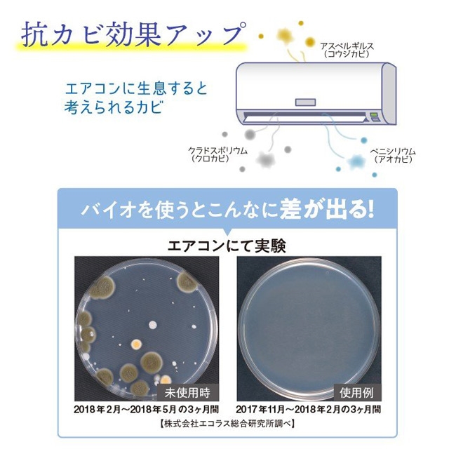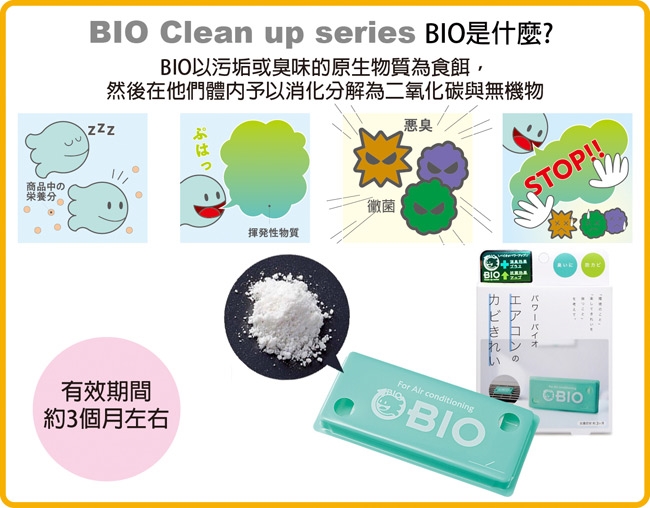 1.新BIO可對抗5種黴菌(黑黴、青黴、紅黴、麴黴、高滲麴黴等);消除氨、醋酸、三甲胺、硫化氫等4種異味,消臭防霉POWER UP!