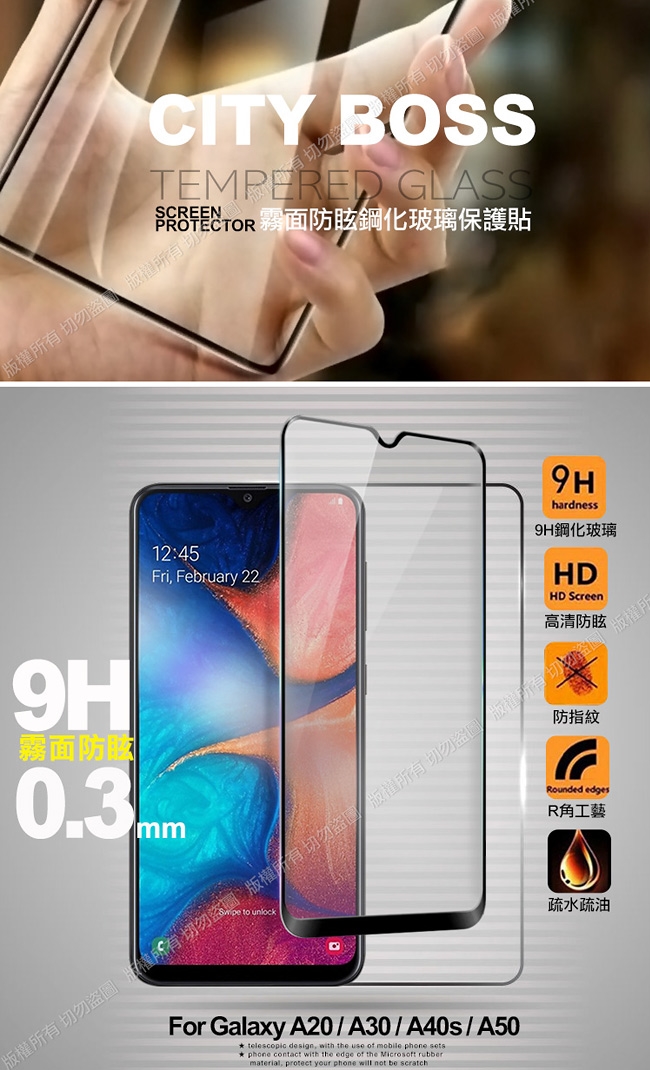 CITYBOSS for 三星 Samsung Galaxy A20 / A30 / A40s / A50 霧面防眩鋼化玻璃保護貼-黑