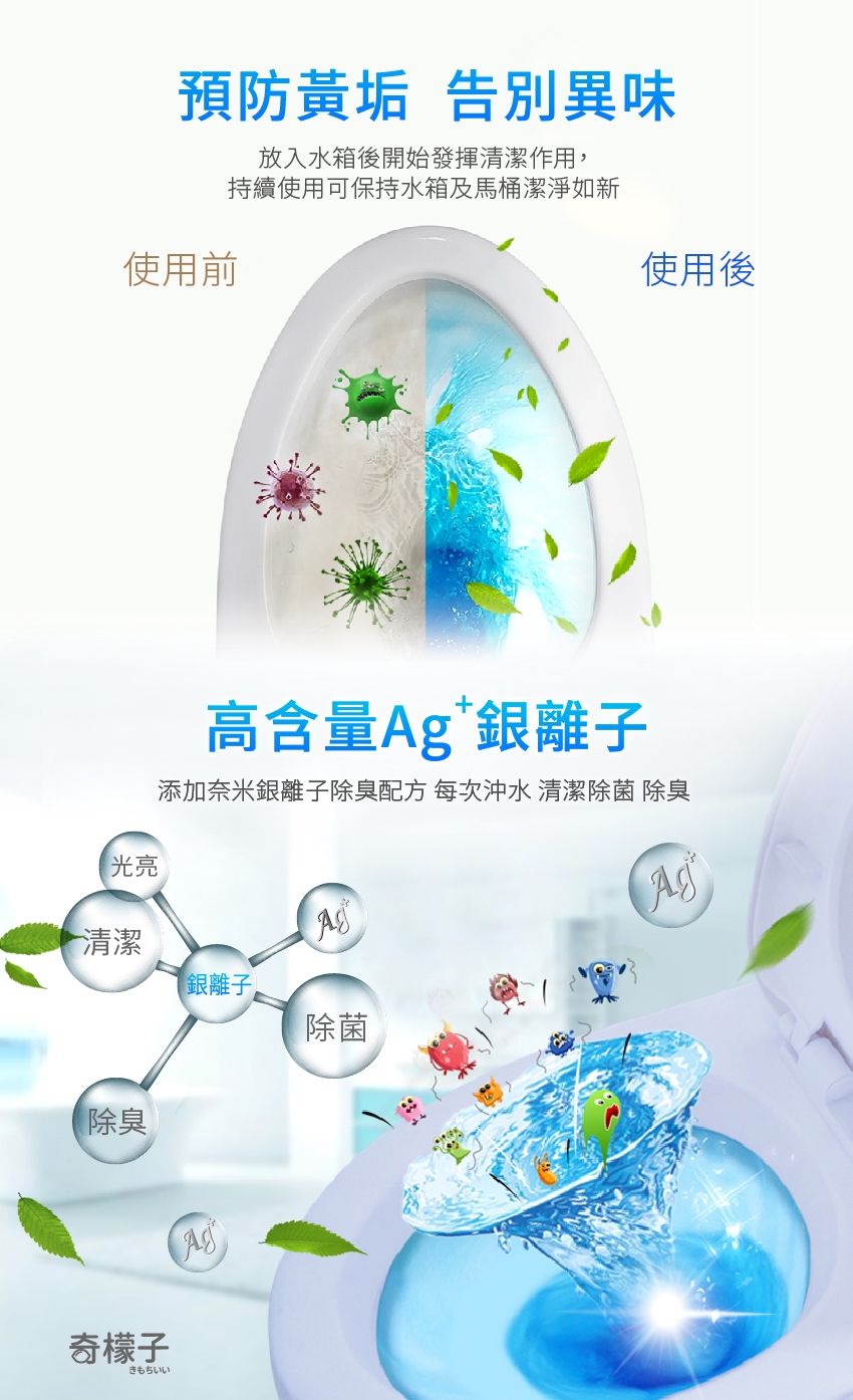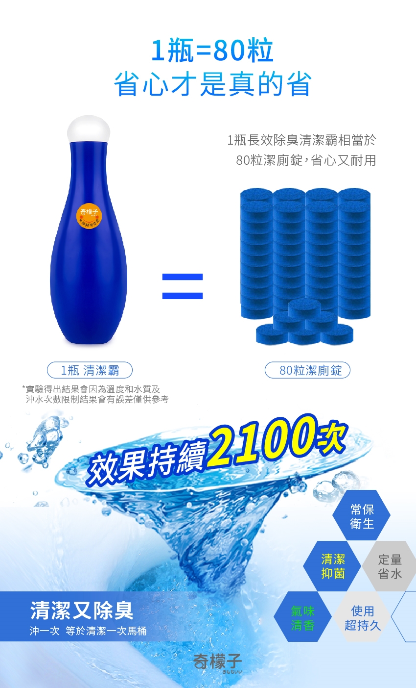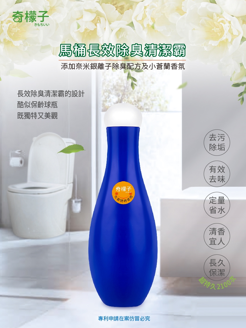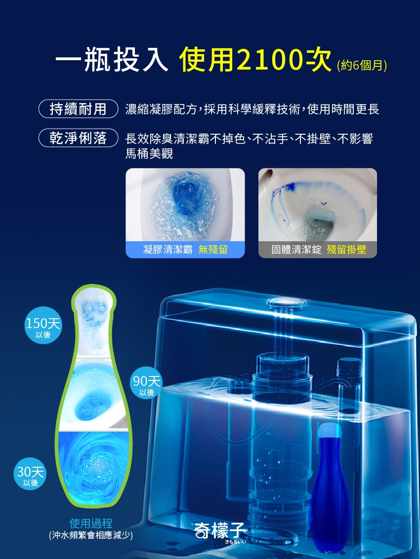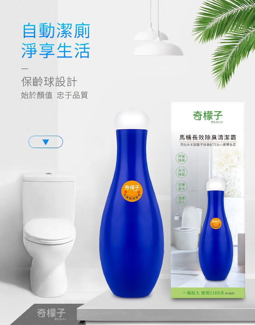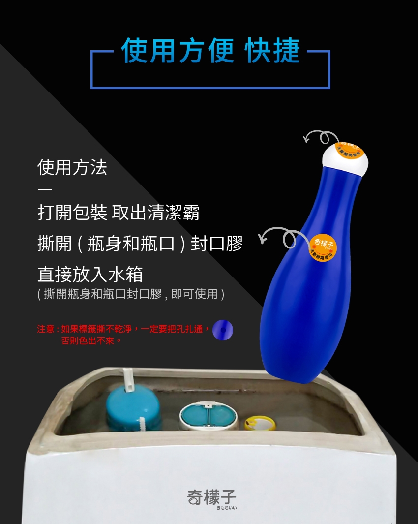 拆封包裝取出馬桶長效除臭清潔霸,使用前,先撕開封口膠(瓶身和瓶口),沖水降低水位,直接放入水箱中,待水從瓶蓋的氣孔中注入瓶子後,整瓶會自然沉入水箱底部。(投放位置盡量遠離出水口)等待數分鐘後,瓶口的微孔會釋放藍色清潔劑,沖水時會自動清潔廁盆。