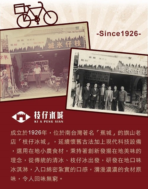 成立於1926年,位於南台灣著名「蕉城」的旗山老店「枝仔冰城」,延續傳統古法加上科技或自動設備生產出在地台灣精神的冰品,