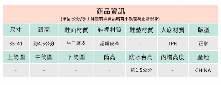 2.鞋類商品依功能及用途之不同,鞋底各有其止滑係數之個別不同,使用鞋類商品請用於正常平坦之路面,非雨鞋或雨靴類商品,請避免穿著於下雨濕滑路面上行走。