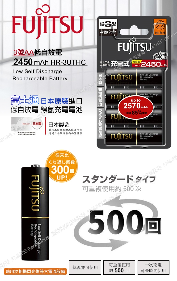 日本製 Fujitsu富士通 低自放電高容量2450mAh充電電池HR-3UTHC (3號12入)