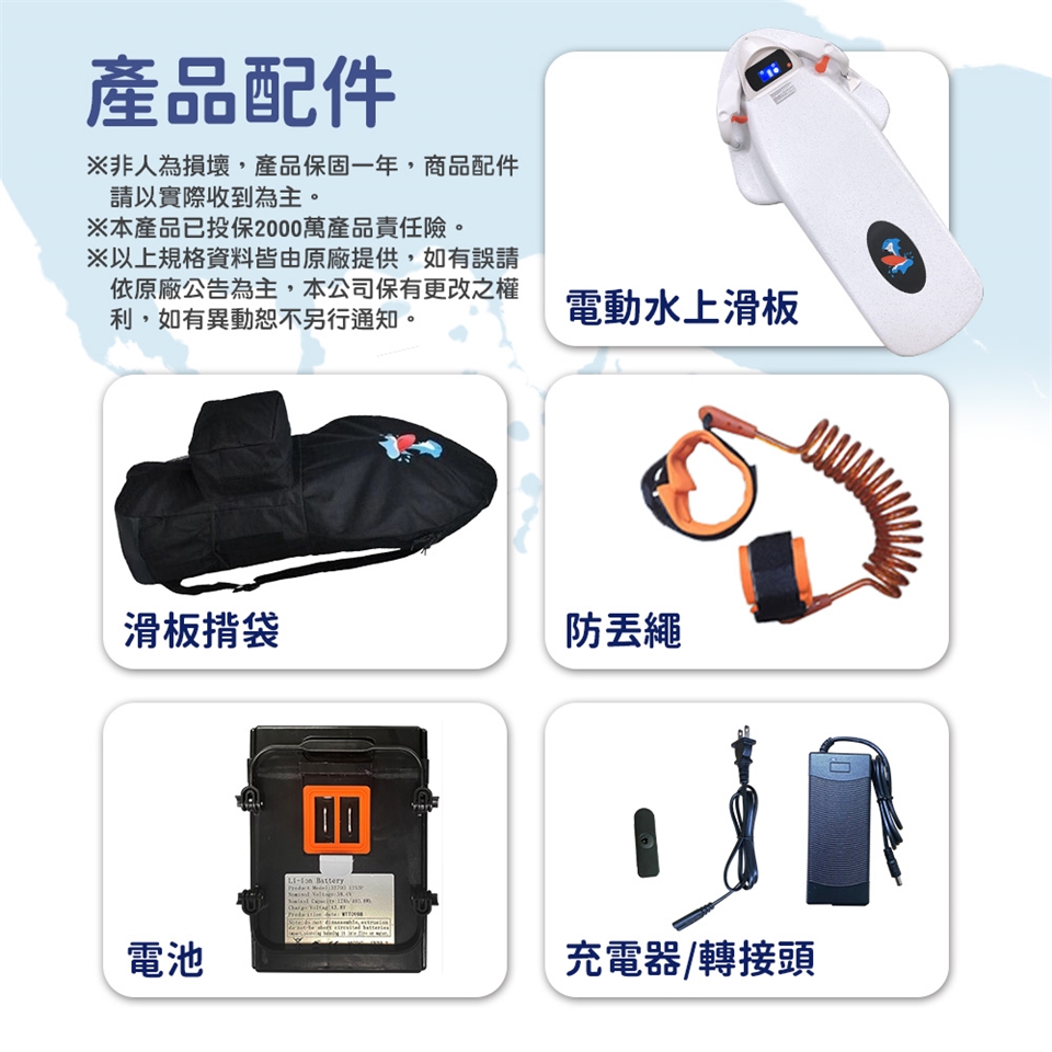 配件:電動滑板主體/專用背袋/充電器/轉接頭/電池/防丟繩/保卡(說明書)