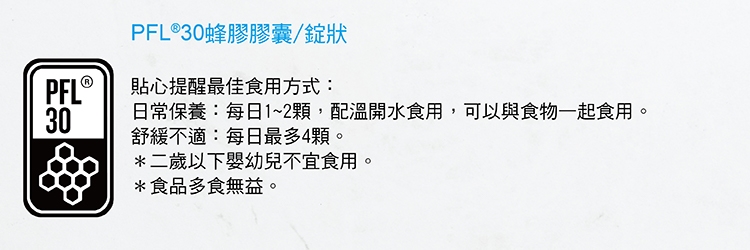 *兩歲以下嬰幼兒不宜食用*少數個例對蜂膠有過敏現象,若有請停止食用並多喝開水*若第一次食用前包裝經拆封,請勿食用