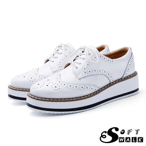 【SOFT WALK 舒步】真皮英倫風布洛克刻花經典厚底綁帶牛津鞋 漆皮白