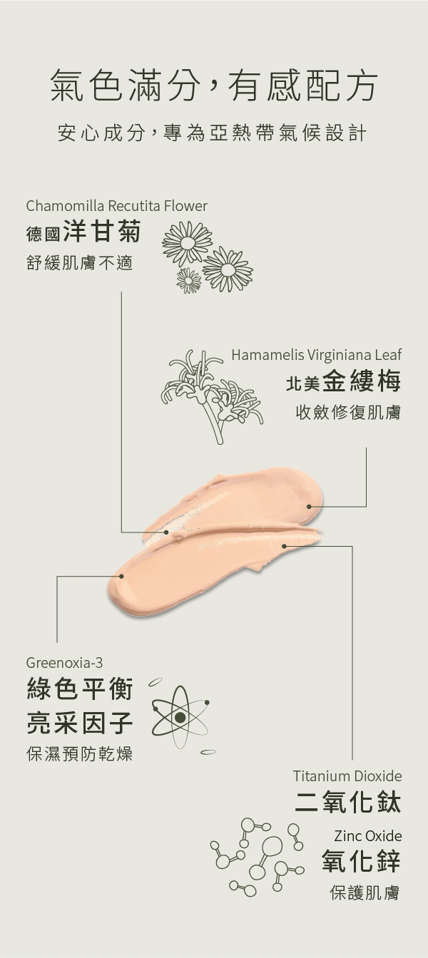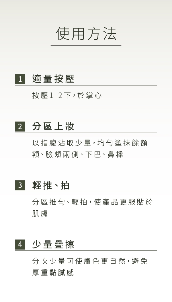 基礎保養後,取適量推勻臉部及脖子即可。
