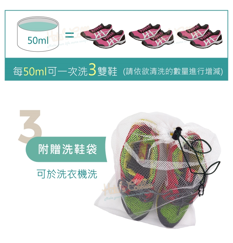 每50ml可一次洗3雙鞋(請依欲清洗的數量進行增減)