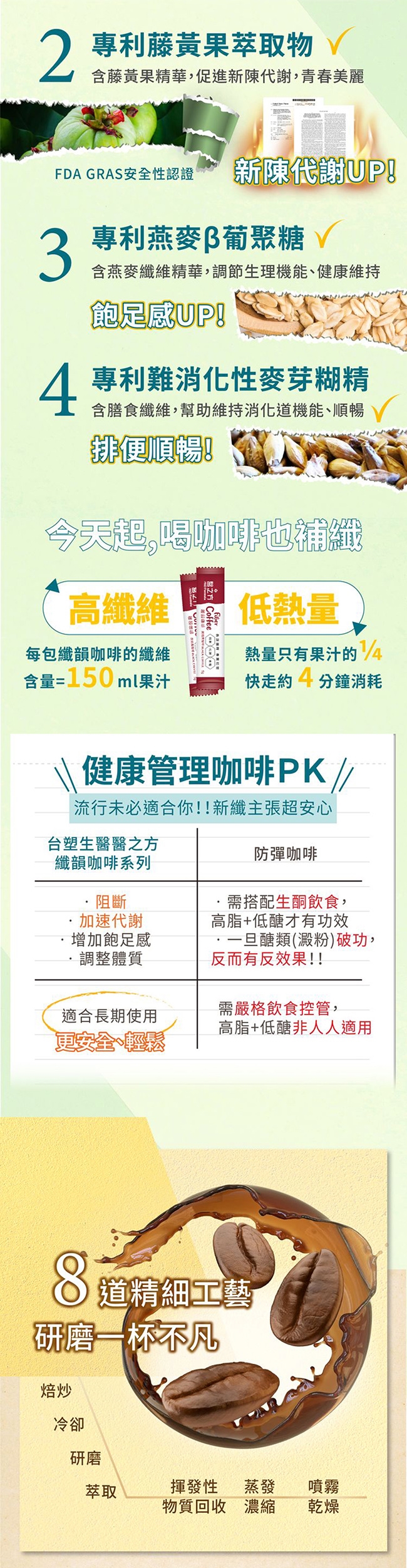 成 份: 咖啡粉、麥芽糊精(含樹薯澱粉、水)、難消化性麥芽糊精、香料[含麥芽糊精、阿拉伯膠、香料、三乙酸甘油酯、L-抗壞血酸(抗氧化劑)]、二氧化矽、關華豆膠、碳酸氫鈉、仙人掌萃取物、藤黃果萃取物、燕麥β葡聚糖