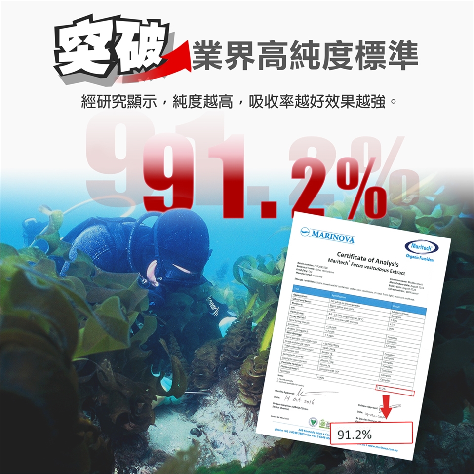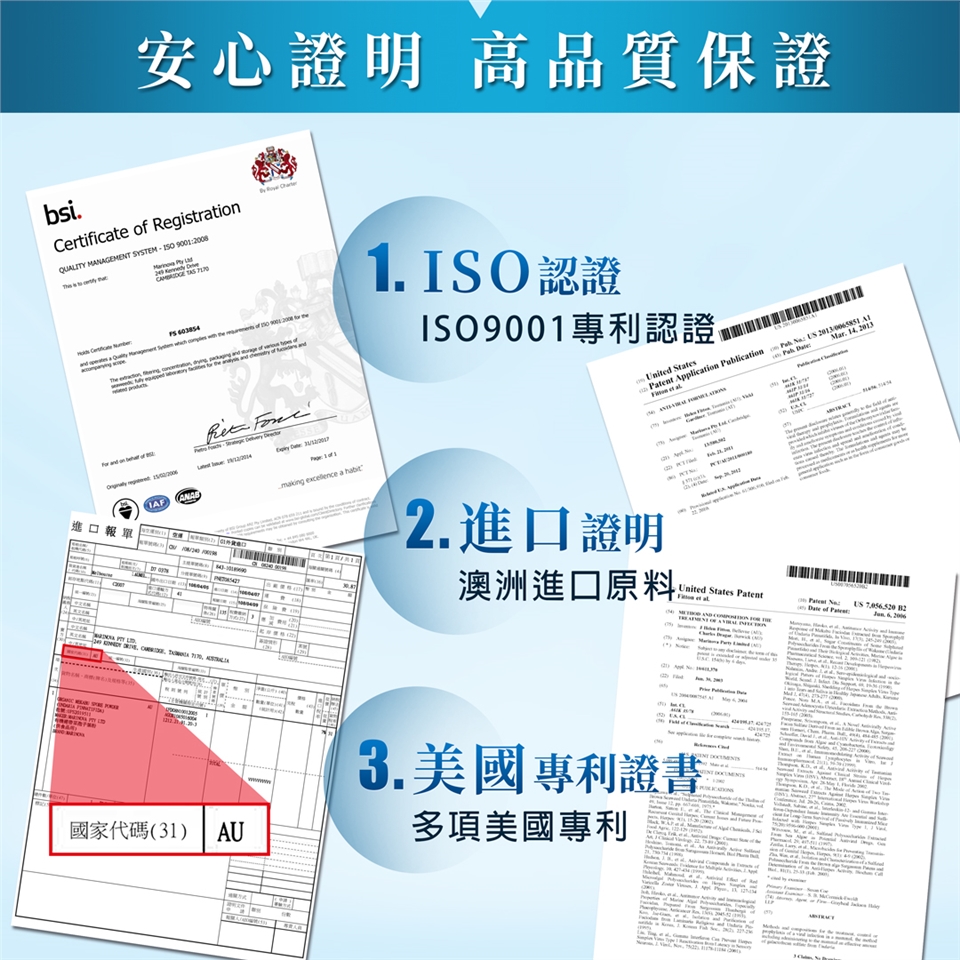 萃取出的高單位90%褐藻醣膠,除了純度獲得檢測單位的認證外,更擁有許多國際性的認證,經由嚴密地篩選提升完整的活性精華!!
