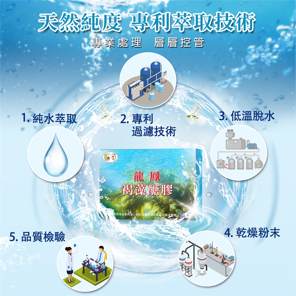 龍鳳生技進行式採用澳洲Marinova運用純手工採收方式,採取墨角藻並利用專利技術「低溫冷水反覆萃取法」達到高濃度濃縮褐藻醣膠