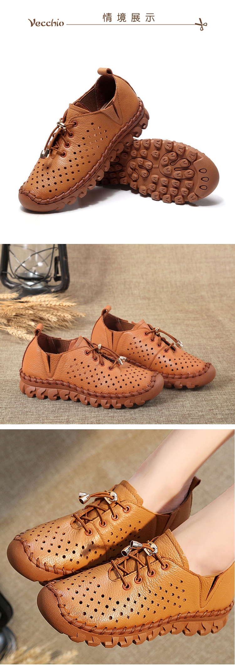 【Vecchio】全真皮頭層牛皮手工縫線沖孔縷空彈力抽繩繫帶厚底休閒鞋 ( 棕 )
