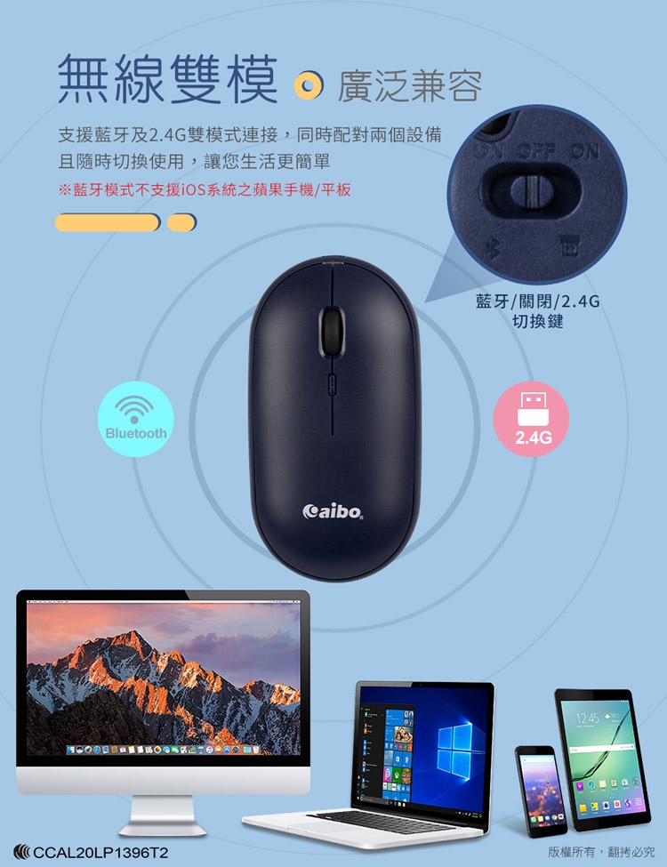 aibo 藍牙/2.4G雙模式 充電靜音無線滑鼠(LY-ENMSRWB)