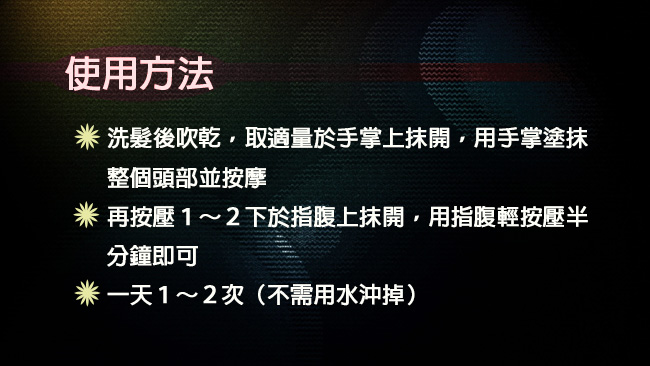 *密絲使用方法:洗髮後吹乾,取適量於手掌上抹開,用手掌塗抹整個頭部並按摩之;再壓按1~2下於指腹上抹開,用指腹輕按摩頭皮半分鐘即可,一天1~2次(不需用水沖掉)