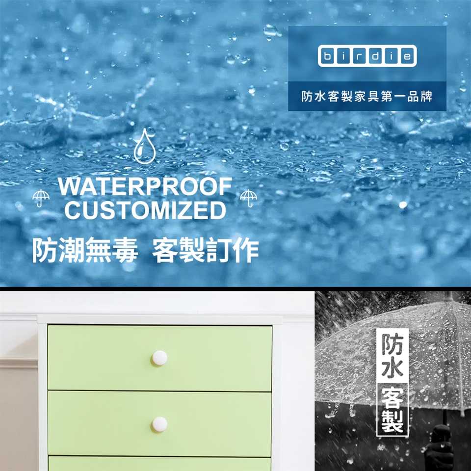100%徹底防水板材,不怕浸水、適用長期潮濕的環境,可整組水洗清潔更容易,不因潮濕而變形、腐蝕、掀皮;具防蟲蛀抗黴菌特性,防白蟻、蟑螂侵蝕,長久使用也不用擔心塌陷變形!
