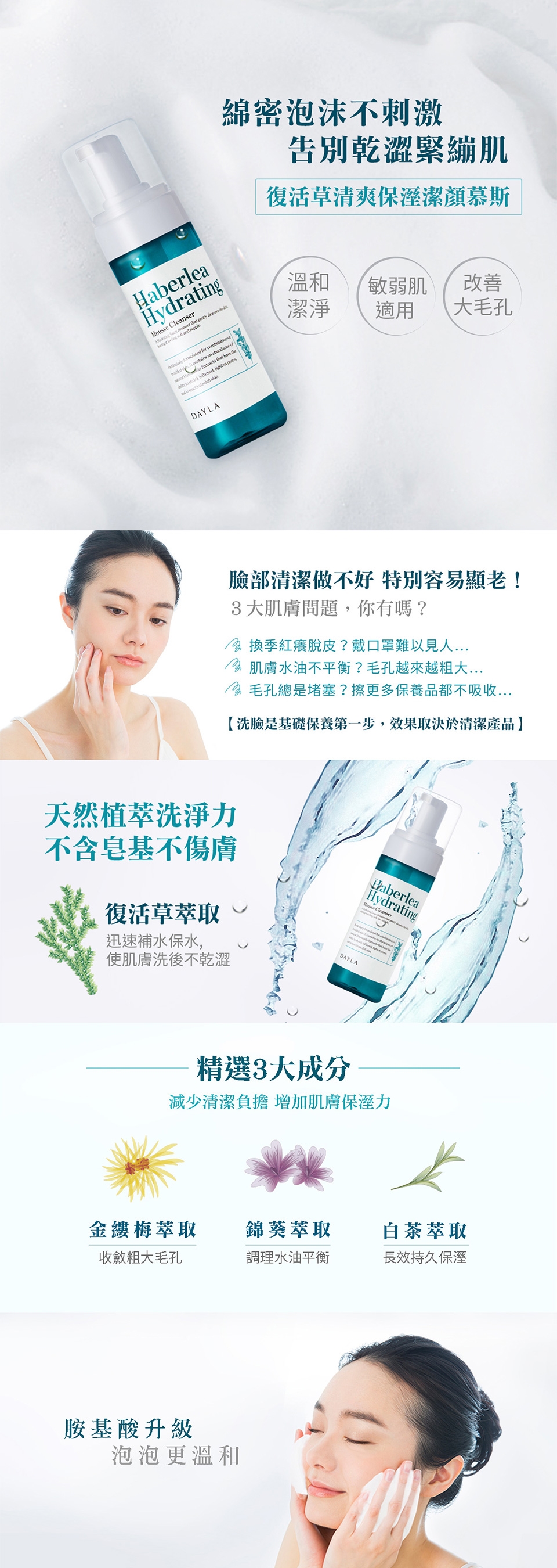 按壓適量慕斯泡沫於手掌,輕搓揉於臉部做清潔最後以清水洗淨即可