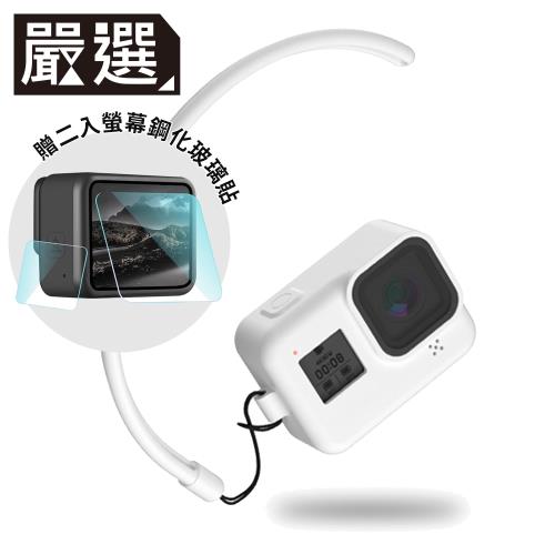 嚴選 GoPro HERO8 BLACK 矽膠掛繩保護套+2入螢幕鋼化玻璃貼組 白
