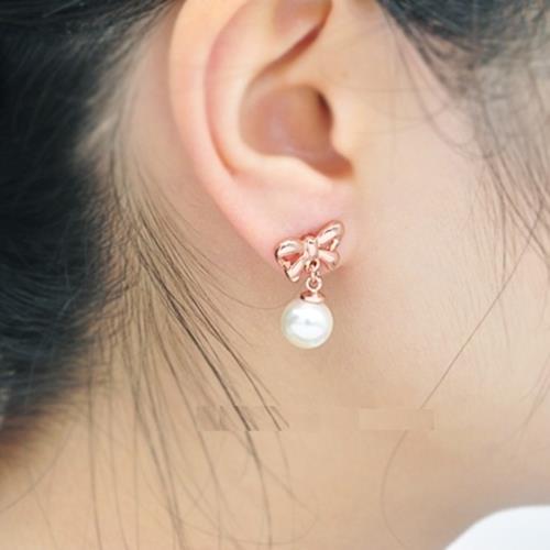 【Emi艾迷】韓國可愛女人優雅蝴蝶結珍珠耳環