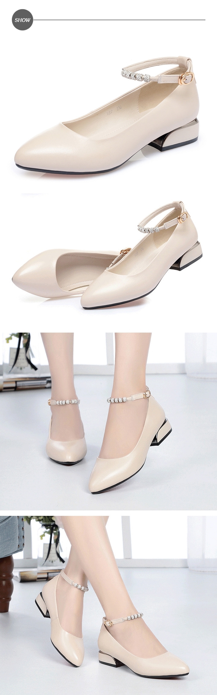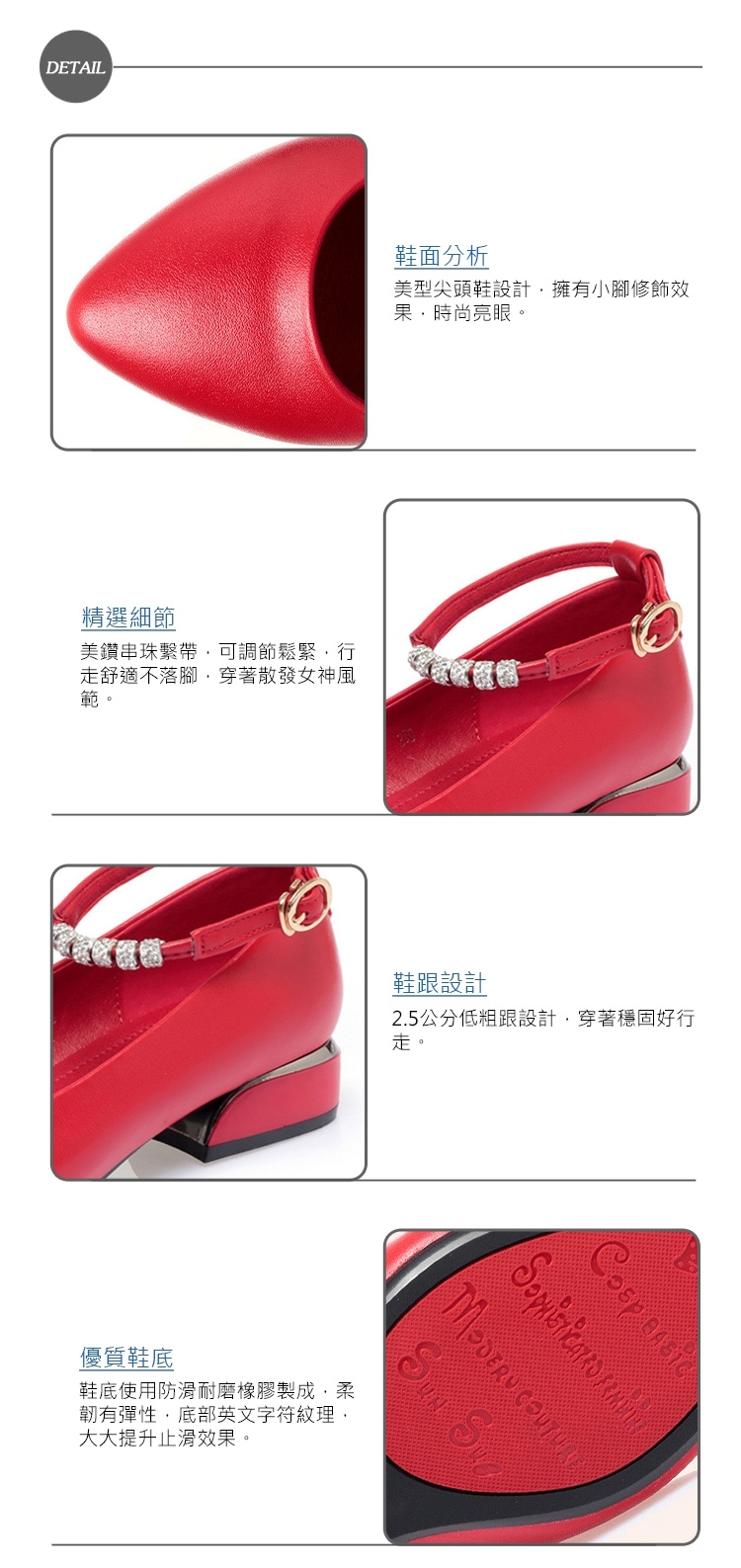 【MOM】真皮細緻牛皮美鑽串珠繫帶金屬粗跟鞋 ( 米 )