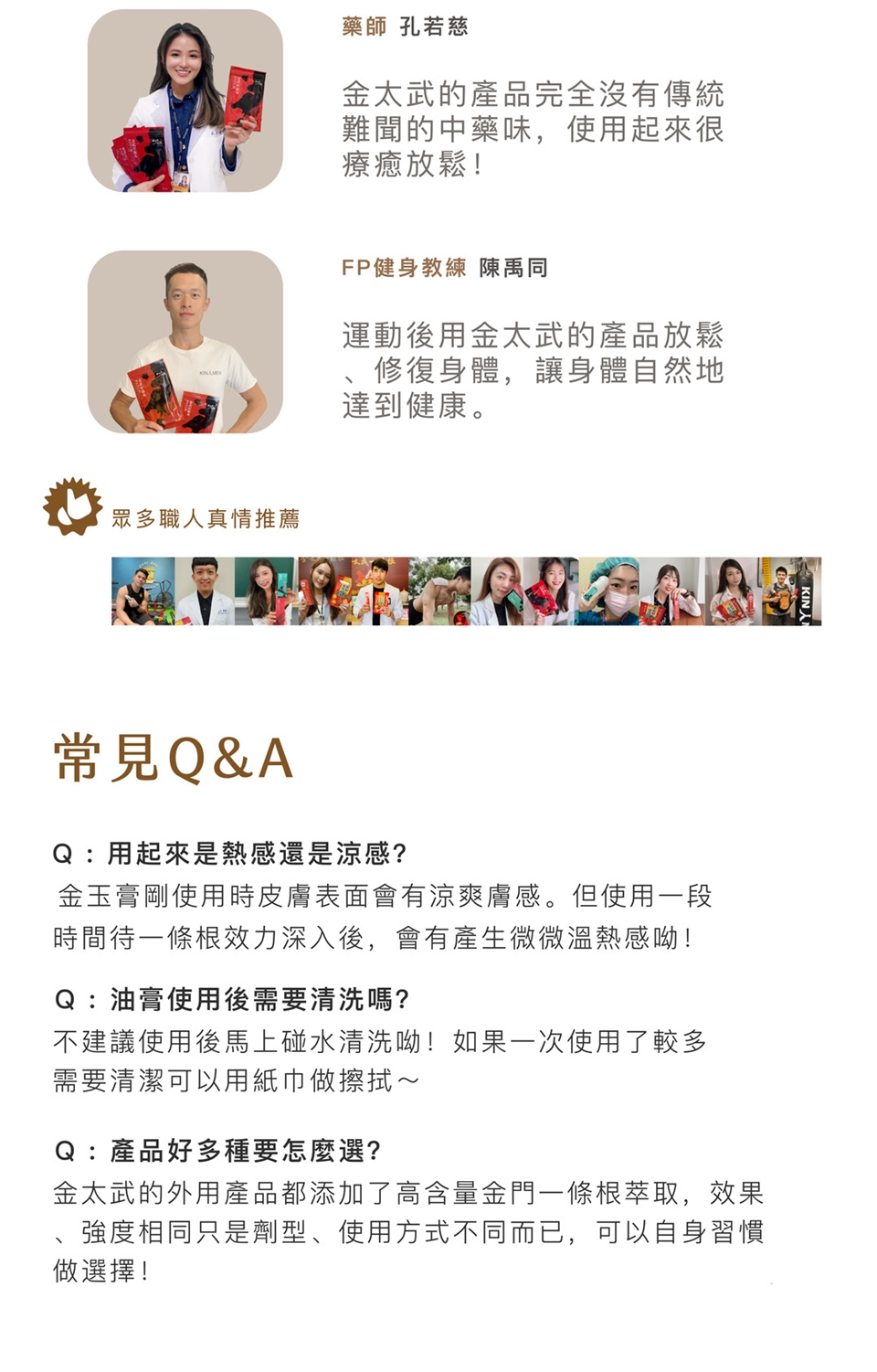 成分:金門一條根萃取液、檀香精油、尤加利精油、薄荷精油、玫瑰精油、馬郁蘭精油、黃金薑黃萃取物、貓爪藤、凡士林、蜜蠟。