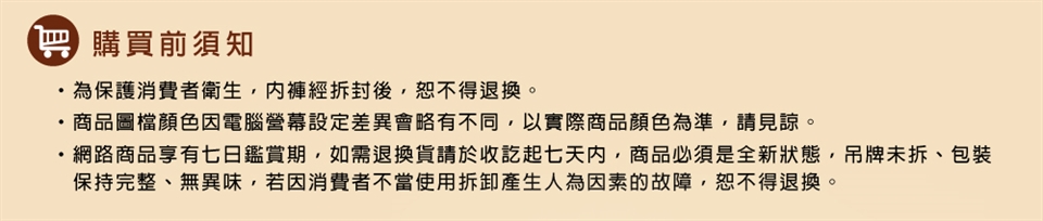 ► 基於衛生健康問題與維護顧客權益,貼身內褲、口罩、眼罩、襪子以及所有寢具商品,在您還不確定是否要辦理退貨前,請勿拆標與使用。